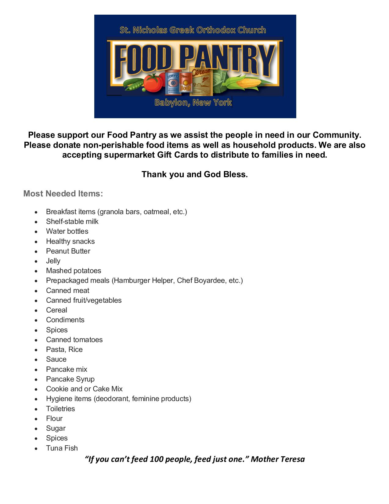 If you would like to visit out Food Pantry or Donate items, please contact our office at 631.587.1150 for further information and hours.